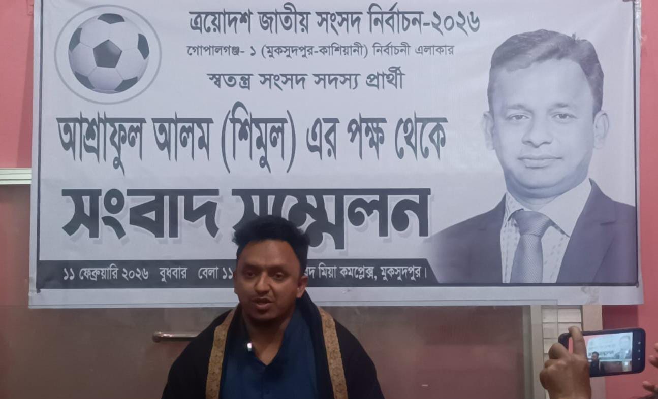 সাংবাদিকদের পেশাগত নিরপেক্ষতা বজায় রাখার আহ্বান জানিয়ে গোপালগঞ্জ-১ (মুকসুদপুর-কাশিয়ানী) স্বতন্ত্র প্রার্থী কারাবন্দী আশ্রাফুল আলম (শিমুল) এর পক্ষে তার ছোট ভাই ব্যারিস্টার নাজমুল আলম সবুজ বলেছেন রাজনৈতিক চিন্তাধারা এবং পেশাদারিত্বকে আলাদা রাখতে হবে। বুধবার (১১ ফেব্রæয়ারি) সকালে মুকসুদপুর ফরিদ মিয়া কমপ্লেক্স আয়োজিত সংবাদ সম্মেলন তিনি গণমাধ্যমকর্মীদের প্রতি এই আহ্বান জানান। ফেসবুকের ভুয়া তথ্যে বিভ্রান্ত না হওয়ার জন্য গোপালগঞ্জ-০১ (মুকসুদপুর-কাশিয়ানী) আসনের জনসাধারণের প্রতি আহ্বান জানিয়েছেন। তিনি আরো জানান নির্বাচন ফেয়ার হবে তাই সকলে ভোট দিতে যাওয়ার আহ্বানও জানিয়েছেন।